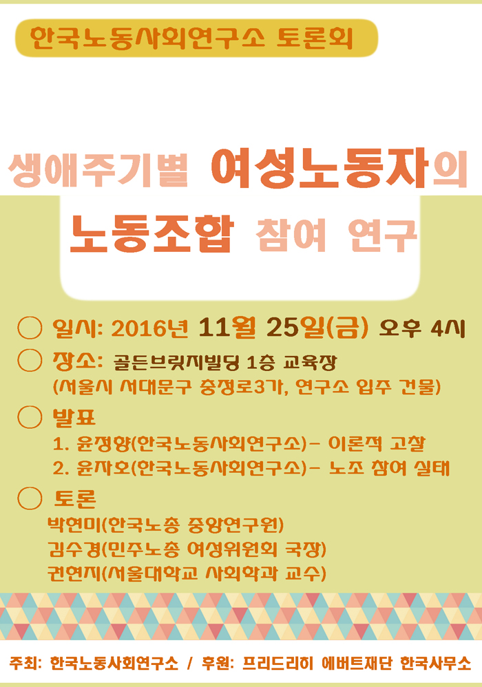 한국노동사회연구소는 오는 11월 25일(금) 오후 4시에 토론회 '생애주기별 여성노동자의 노동조합 참여 연구'를 개최합니다.