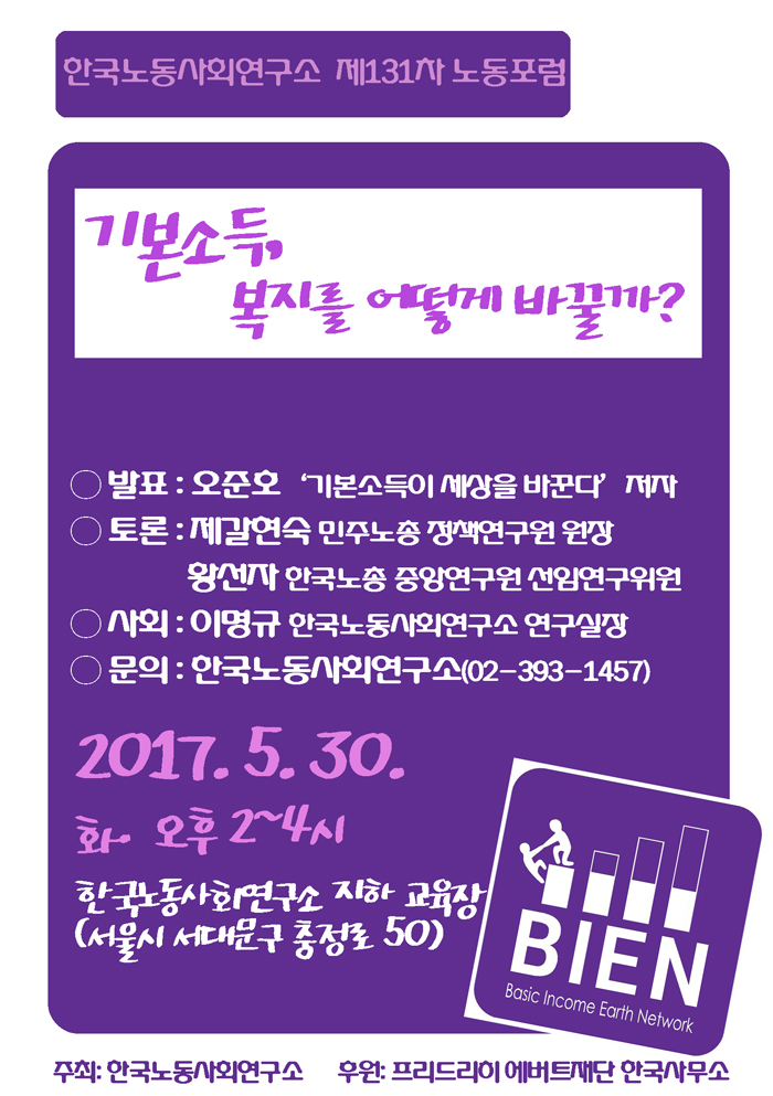 한국노동사회연구소는 오는 5월 30일 오후 2시에 제131차 노동포럼 '기본소득, 복지를 어떻게 바꿀까?'를 개최합니다.