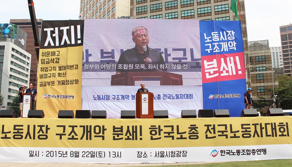양대노총의 2015년 상반기 대정부 투쟁이 마무리됐다. 한국노동조합총연맹은 8월22일 시청광장에서 열린 노동시장 구조개악 저지를 위한 전국노동자대회에서 “상반기 총력투쟁의 열기와 성과를 승리적으로 계승하고, 오늘을 계기로 투쟁대오를 강화해 하반기 전면투쟁에 임할 것을 결의한다”고 밝혔다. 민주노동조합총연맹은 이보다 앞선 7월15일 서울역광장에서 열린 2차 총파업에서 11월14일 민중총궐기 투쟁계획을 선포했다. 정부가 하반기 국정 기조의 방향을 ‘노동시장 구조개혁’으로 잡고 각종 정책과 여론을 동원해 노동자들을 거세게 밀어붙이고 있는 상황에서 양대노총이 숨 고르기에 들어간 모양새다.