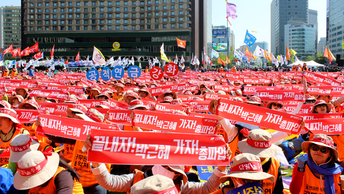 <사진: 4월24일 시청광장에서 열린 민주노총 총파업에 참가한 조합원들이 구호를 외치고 있다. ⓒ한국노동사회연구소>