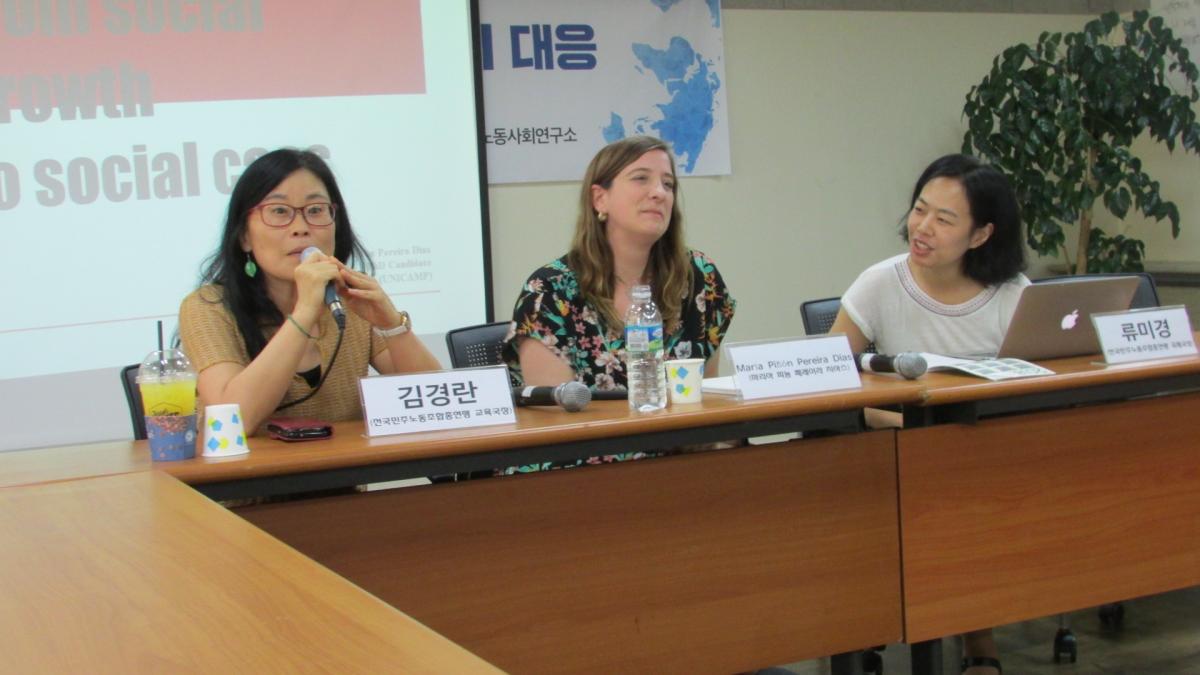 사회   오늘 발표를 해주실 마리아 피뇽은 브라질에서 캄피나스 시에 있는 유니캠프UNICAMP 대학원에서 경제학 박사과정을 하고 있습니다. 그래서 아마 저희가 한 시간 정도 발표를 듣고 질의응답을 통해서 현지의 브라질의 따끈따끈한 그런 상황들을 들을 수 있을 것 같습니다. 오늘 같이 마리아의 이야기를 통역을 해주실 분이 있습니다. 민주노총 국제국장 류미경 동지입니다. 반갑습니다. 그러면 먼저 마리아로부터 발표를 듣겠습니다.