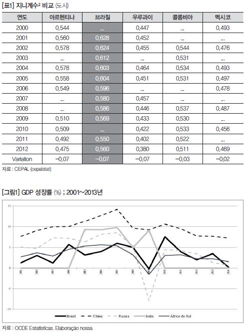 우선 [표1]은 브라질과 4개국의 지니계수를 나타낸 것인데요. 2000년부터 2012년까지 이 시기가 룰라 대통령 1기, 2기와 지우마 대통령 1기까지 포함하는 시기입니다. 이 시기에는 경제적 상황이 상당히 개선된 것을 보실 수 있습니다. 지니계수는 얼마나 불평등이 해소됐는지를 보여주는 사회발전 척도로 쓰이는데요. 이 시기에 브라질에서는 불평등이 많이 축소되었습니다. 그 이유는 실업이 줄었고 임금이 증가했고, 상하수도 같은 위생시설과 같은 인프라 접근성이 증가했기 때문입니다. 아르헨티나나 우루과이 같은 중도좌파 국가도 비슷한 변화를 볼 수 있습니다. 반면, 우파정권 국가들인 콜롬비아와 멕시코의 지니계수를 보면 약간 개선은 되었지만 그 변화가 작습니다.