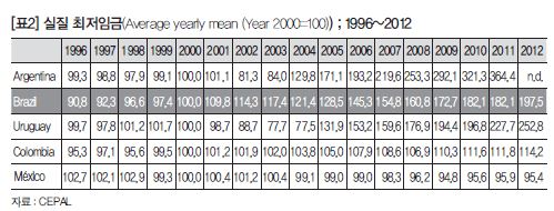 [표2]를 보면 실질 최저임금 증가를 볼 수 있는데요. 1996년부터 나와 있는데 2000년대를 100이라고 하면, 이후 엄청나게 최저임금이 증가했는데, 브라질 상황에서는 큰 변화입니다. 브라질 인구의 절반 이상이 최저임금 수준에 의존해서 생활하고 있기 때문에, 최저임금의 인상은 브라질 인구 절반의 소득 증대로 이어지고 이것이 수요의 증대로 이어졌습니다.