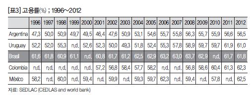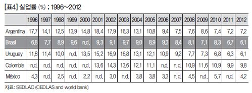 전체 노동인구 중에서 실업상태인 인구 수를 나타내는 실업률을 살펴보면 1990년도 경제위기 후반에는 계속 오릅니다. 이 증가는 2003년 9.7%로 정점을 찍습니다. 이때까지만 해도 룰라가 대통령에 당선되었지만, 이전 경제위기 영향이 계속 지속되고 있습니다. 그 이후에 계속 줄어들어서 2012년에 6.1%까지 떨어지는데 비교해보면 2012년에는 1996년보다 낮은 수준으로까지 떨어집니다.