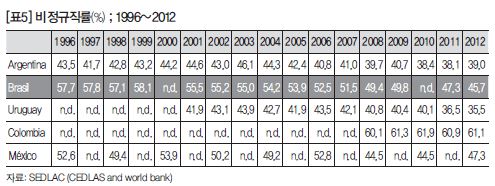 [표5]는 비공식부문을 보여주는 표인데요. 한국에서는 비정규직이라고 부르는 것입니다. 비정규직 부문이 4개의 범주로 나누고 있는 걸로 알고 있습니다. 비정규직 규정은 나라마다 개념이 조금씩 다른데요. 브라질은 세금을 잘 내지 않는 자영업자나 하청노동자 중에서 불안정계약을 통해 고용된 노동자들을 말합니다. 비정규직 부문이 크게 감소하는 것을 확인할 수 있습니다.