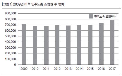 이렇게 민주노총 소속 노조의 조직확대 경향은 가시적인 수치로도 확인된다. 열린 국면 속의 노조에 대한 인식 변화, 실천적, 직접적 움직임들의 강화가 실제로 노조 가입 증가로 이어지고 있는 것이다. 민주노총 전체 조합원은 2017년 1월 73만 4,369명에서 1년만인 2018년 1월 78만 6,563명으로 5만여 명이 증가하였다([그림 1] 참조). 지난 10여 년 70만 명을 넘기 힘들었던 조합원 수가 가파른 상승을 보이기 시작하고 있다. 거의 모든 민주노총 산별조직들이 이러한 열린 국면 속의 변화를 주도하기 위한 조직확대 사업 방향을 설정하고 인적, 물적 자원 투여를 확대하고 있다.