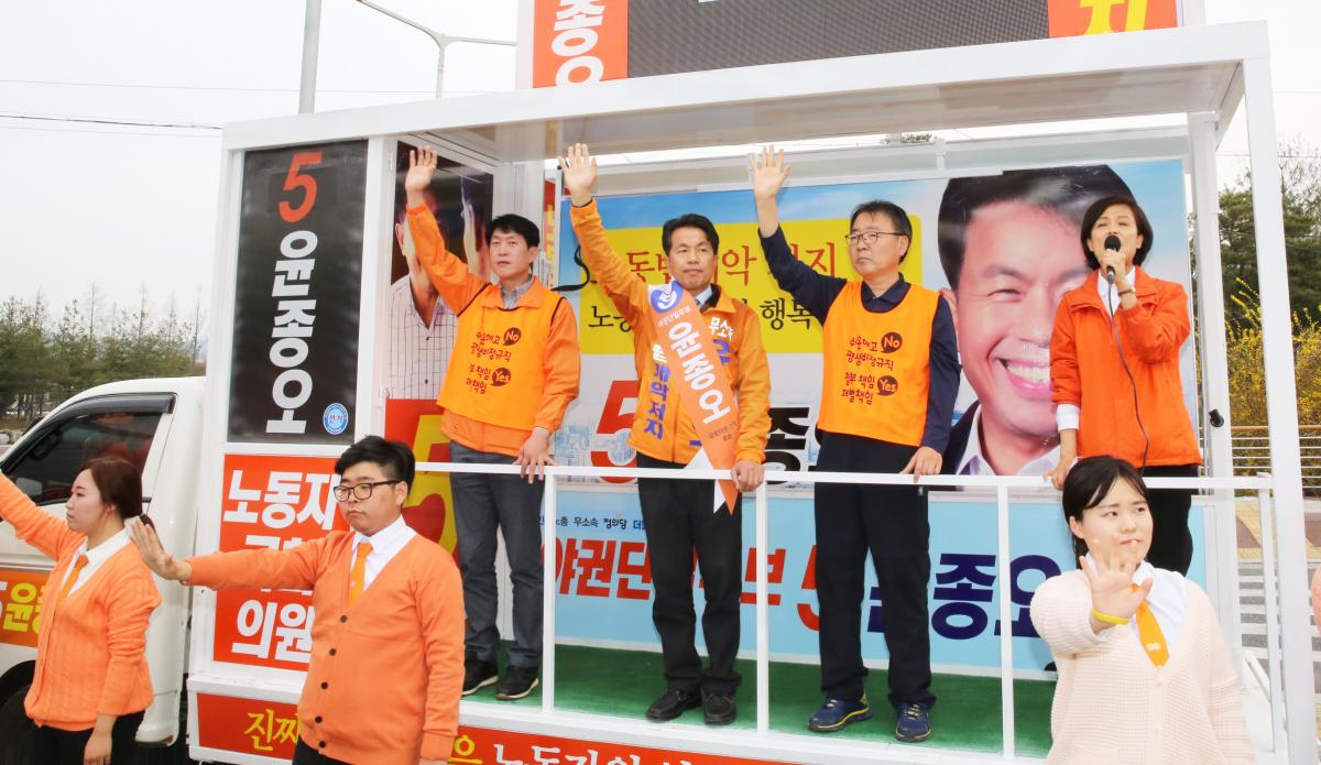 선거운동원들의 유세 현장에는 민주노총 정치실천단이 함께 했다. 노동개악 저지를 구호로 내걸고 새누리당의 흑색비방선전에 적극 맞섰다. 그동안 여러 선거에서 노동계는 계파에 따라 후보를 놓고 적극적 혹은 소극적으로 달리 지지한 적이 많았다. 그러나 이번 울산 북구 선거만큼은 계파를 떠나 모두가 한 목소리로 윤종오를 지지했다. 새누리당과 박근혜 정부의 노동개악과 반노동정책이 노동자를 하나로 뭉치게 만든 것으로, 어떤 외압과 이념공세도 그 기세를 꺾지 못했다.