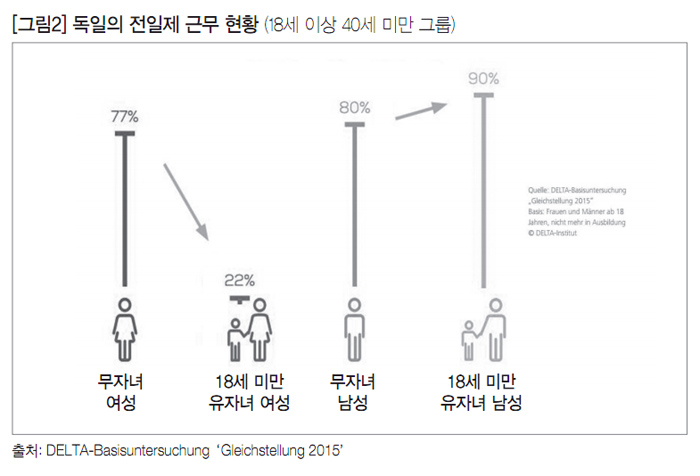 그동안 독일 여성의 노동시장 진입은 계속 증가하였고 세계적으로도 높은 고용률을 보이고 있다. 그러나 근무형태와 관련해서는 남녀 간에 큰 차이가 있다. [그림2]에서 보는 바와 같이 자녀가 없는 독일 여성의 77%는 전일제로 근무하지만, 미성년 자녀가 있는 경우 전일제 근무율은 22%로 급격하게 하락한다. 이는 전일제로 근무하는 남성 중 자녀가 없는 경우 80%였던 전일제 비율이 미성년 자녀가 있는 경우 90%로 오히려 증가하는 것과 매우 상반되는 현상이다. 또 다른 2013년 통계를 살펴보면 유자녀 여성 노동자는 시간제로 근무하는 비율이 70%인데 반해, 유자녀 남성 노동자의 시간제 근무 비율은 6%에 불과하다. 이러한 결과는 육아, 가사와 가정 내 돌봄에 있어서 여성의 책임이 여전히 크다는 것을 보여준다.