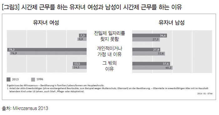 [그림3] 에서 보는 바와 같이 2013년 유자녀 여성이 시간제 근무를 하는 이유 중 약 80%는 가사와 육아, 가족 내 돌봄이 필요한 구성원 때문인 것으로 나타났다. 이렇게 여성들은 육아와 가사 또는 가정 내 돌봄을 이유로 시간제 근무를 함으로써 경력 단절을 경험하고, 이후 재취업을 하더라도 시간제 근로와 미니잡(월소득 450유로 이하인 고용형태)을 하게 되는 경우가 많다.
