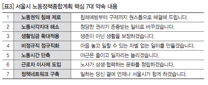2015년 서울시는 「노동정책 기본계획」을 통해 2대 정책 목표, 4개의 정책과제, 16개 분야별 61개 단위과제를 제시했고, 올해 4월27일 발표한 노동정책 종합계획을 통해 노동정책을 연착륙시키고 있다. 또한 올해 ‘노동존중특별시 서울’을 위한 7대 약속으로 △노동권익 침해 제로, △사각지대 해소, △생활임금 확대 적용, △비정규직의 정규직화 등을 발표했다. 서울시는 향후 7대 약속 위주로 노동정책 시행상황을 집중 관리하되, 기존 노동정책의 모니터링도 진행할 예정이다.