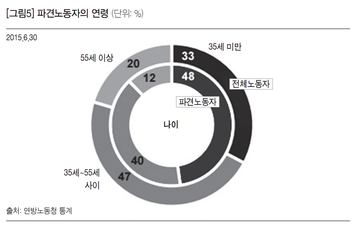 파견노동자들의 나이는 압도적으로 젊은 편이다. 전체 노동자 중 35세 미만의 비율은 약 3분의 1 정도인데 반해 35세 미만의 파견노동자는 절반가량을 차지한다. 반면 55세 이상 파견노동자의 비율은 12%에 불과하다. 전체 노동자 중 55세 이상 노동자의 비율은 20% 정도이다.