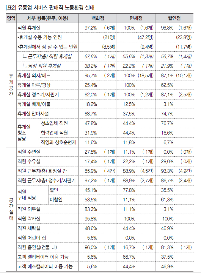 그러나 국내 유통업체의 휴게공간이나 시설은 프랑스 등 유럽에 비해 열악하다. 백화점, 면세점, 할인점 내 휴게공간(114곳)을 조사한 결과, 입점협력업체 직원들이 사용할 수 있는 휴게실이 대부분 존재하기는 하나, 실제 사용할 수 있는 상황은 아니었다. 2015년 기준 주요 유통업체의 휴게실 수용 가능 인원은 백화점 21명, 면세점 47.2명, 할인점 23.8명 수준이며, 심지어 전체 직원 대비 휴게실 수용 가능 인원이 100분의 1 수준(롯데 및 신세계 백화점 본점, 인천공항 면세점)에 불과한 곳도 있었다.