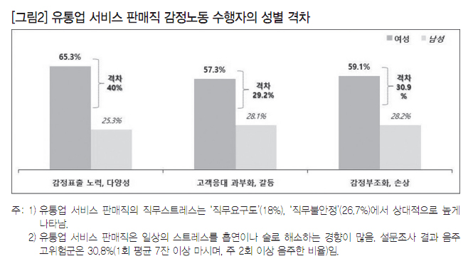 유통업 감정노동 실태조사 결과, 노동자들은 △의식적 노력(96.1%), △기업에서 규정한 감정 표현(89.3%)을 하거나 △감정조절 필요(92.4%), △감정적 힘듦(83.8%)을 경험하는 것으로 나타났다. 특히 감정노동 수행에 있어 성별 격차가 심각한 상황으로, 여성이 남성에 비해 적게는 30%p에서 많게는 40%p 정도 많은 감정노동을 하고 있다.
