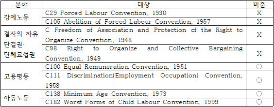 [표] ILO 기본협약(1998)과 한국의 비준 여부