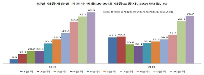 2016년 3월 통계청 경제활동인구조사부가조사에서 20, 30대 기혼자 비율을 살펴보면, ‘남성은 학력수준이 높을수록, 취업하고 고용형태가 안정적일수록, 임금수준이 높을수록 기혼자 비율이 높다.’ 고용주는 기혼자 비율이 75.5%인데 정규직은 53.1%, 비정규직은 28.9%, 실업자는 11.6%다. 임금수준이 가장 낮은 1분위(하위 10%)는 기혼자 비율이 6.9%로 가장 낮은데, 임금수준이 가장 높은 10분위(상위 10%)는 82.5%로 가장 높다. 대졸자는 기혼자가 47.9%인데 중졸자는 35.4%다.