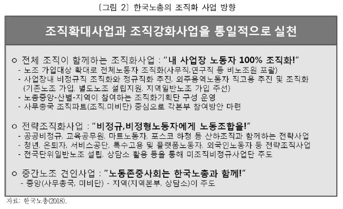 이 글에서는 노동조합 조직률 변동과 관련된 요인들을 검토하여 조직화 전략의 방향에 시사하는 바를 살펴보고, 한국노총과 민주노총의 2018년 전략조직화 사업계획에 대한 평가를 바탕으로 중장기적인 개선 과제를 제시했다.