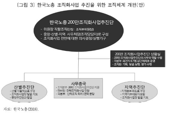 둘째, 한국노총의 2018년 사업계획은 ‘하향식 체계’를 전제하고 있다. 노총 중앙에 “200만 조직화사업 추진단”과 “상황실”을 설치하고, 산업별, 지역별로 하위조직을 설치하여 조직화사업을 관장·지원토록 하고 있다([그림 3] 참조). 반면 현장활동은 신규 활동가를 새롭게 육성하여 전담하도록 하기보다는 단위노조와 지역별 노동교육상담소 등 기존의 인적 역량에게 역할을 부여할 것이라 밝히고 있다. 한국노총 2018년 조직화 사업계획은 “현장 조직역량 강화를 위한 현장간부 양성교육”을 주요 사업방침 중 하나로 제시하고 있지만, 구체적인 대상이나 내용 등은 제시하지 않고 있다. 기존 연구 결과는 노동조합상급단체 소속 조직활동가와 사업장 내 현장지도자(‘초동 주체’)의 효과적인 협력과 의사소통을 조직화 시도의 가장 명확한 성공 요인으로 제시한다는 점에서(Simms, 2015), ‘아래로부터의 자발적인 조직화 시도’를 포괄하기 위한 구체적인 계획이 보완되어야 한다.