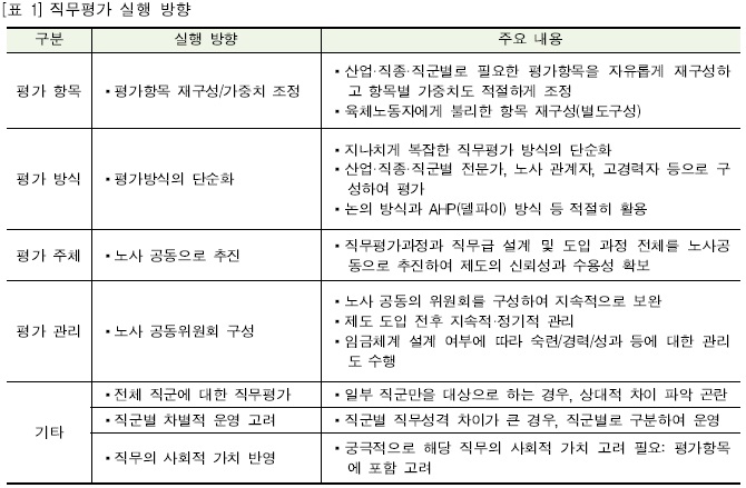 - 평가항목을 재구성하고, 직종별·직군별 가중치를 적절하게 조정할 필요가 있음.