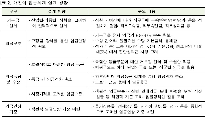 - 급격한 제도 변화로 인한 혼란을 방지하고, 기존의 연공 또는 숙련 요인 등을 가미한 임금체계가 적합할 것으로 판단됨.
